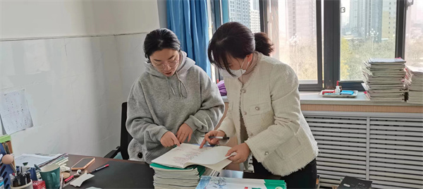 包级主任龚莉莉老师和年级组长王小鸽老师对各班各科的作业数量、作业进度、作业等级、作业纠错、作业评价、作业特色等进行全方位检查。检查老师一本本翻阅,同时详细记录各班级作业的优缺点,时而互相沟通交流,不时发出一些感慨:有对优秀作业的赞叹,也有对自己年级段作业情况的反思。