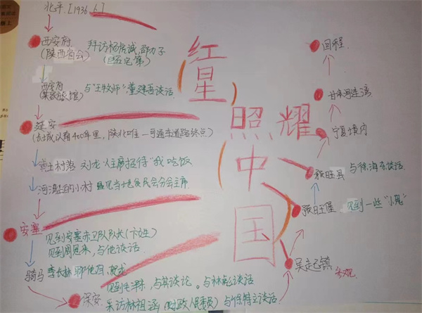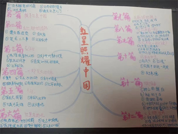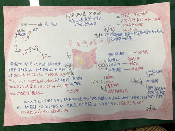 本次个性化作业以《红星照耀中国》为中心,以课外阅读记录卡、思维导图、和手抄报的形式进行制作。八年级同学在课内阅读课精读、细读,老师悉心指导的基础上,积极在课下进行内容的搜集整理,并以绘画装点的形式在作业中展现自己所理解的党的红色精神。