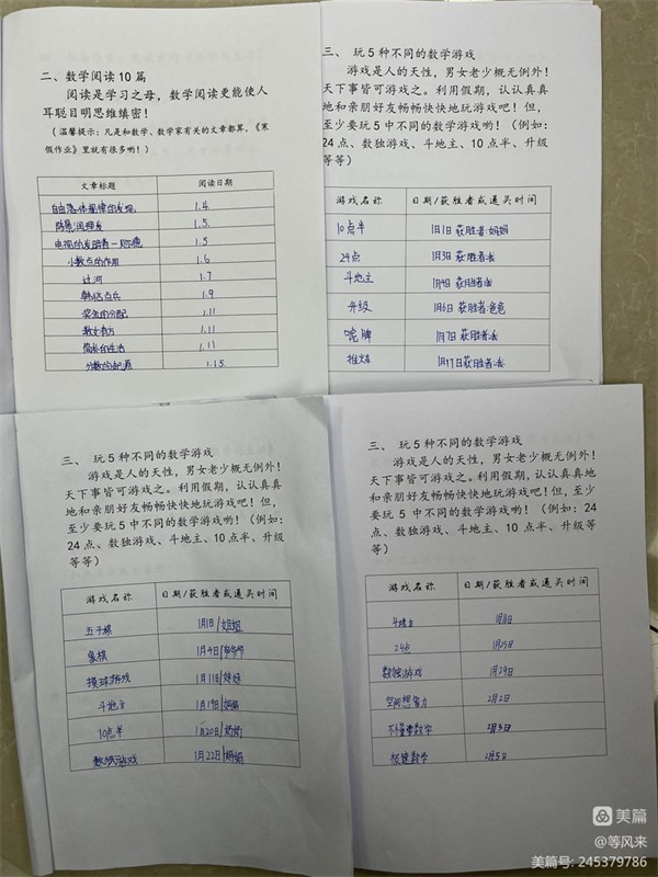 思维缜密的数学需要牢固的基础知识和熟练的计算技能。学如逆水行舟,不进则退,假期里,我们的孩子在休息、过节的同时,认真完成着老师们精心设计的寒假作业,以不同的形式汲取着知识,提高着能力,充实着自己的寒假生活,真正做到了在“玩中学”,在“学中玩”,娱乐学习双丰收。