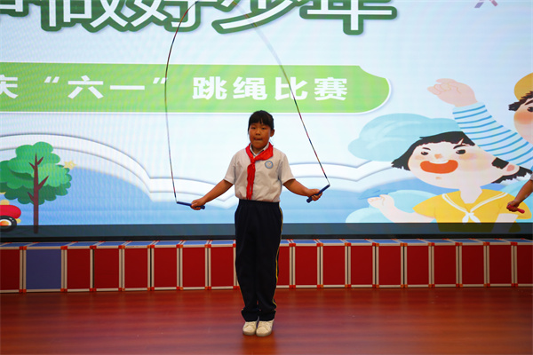 紧接着的全校争霸赛将本次跳绳大赛推向了高潮。各年级选出的三名优秀个人要在这里拼出校级最优秀跳绳选手。此刻的报告厅里紧张热烈、一片欢腾,选手们在交错变换的步伐中奏响激动人心的乐章,翩飞起舞的弧线是跳绳展开的翅膀,击打地面的跳绳不断碰撞出激情飞扬的火花,台下所有的观众热情激动地为选手高喊“加油”、鼓掌助威,每一位选手在舞台上努力拼搏的身姿是这个儿童节里最让人难忘的风景。