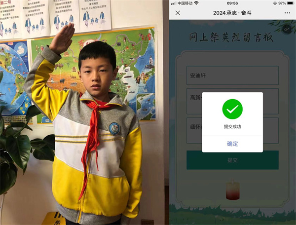 通过开展此次网上祭英烈活动,寄托哀思,追忆历史,缅怀革命烈士,对我校全体少先队员进行了爱国主义教育和忆苦思甜教育,让革命烈士的精神激励他们珍惜当前,奋发图强,争当新时代好少年!