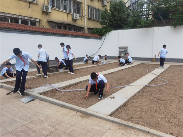 在活动现场,同学们热情高涨,积极投入到各项劳动中。在劳动导师的指导中,孩子们平地、种植、浇水等环节都有条不紊地进行。尤其在种植环节,同学们互相协助,将一颗颗树苗植入土中,充分体现了团队合作和互帮互助的精神。