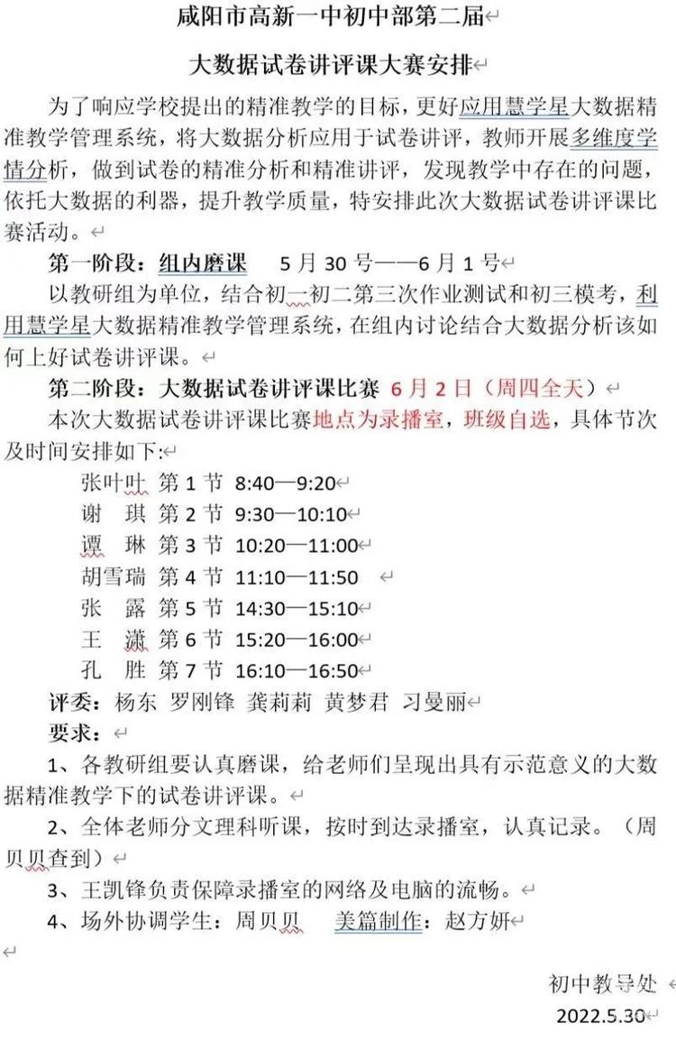 为加快教育高质量、智能化发展,响应学校提出的精准教学目标,咸阳市高新一中初中部借助慧学星大数据教学管理平台,于2022年6月2日举办了第二届大数据试卷讲评课大赛。