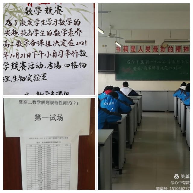 为巩固学生所学知识,培养学习兴趣,高二备课组在10月21日组织了“青蓝杯”数学竞赛,学生们积极报名,踊跃参加。