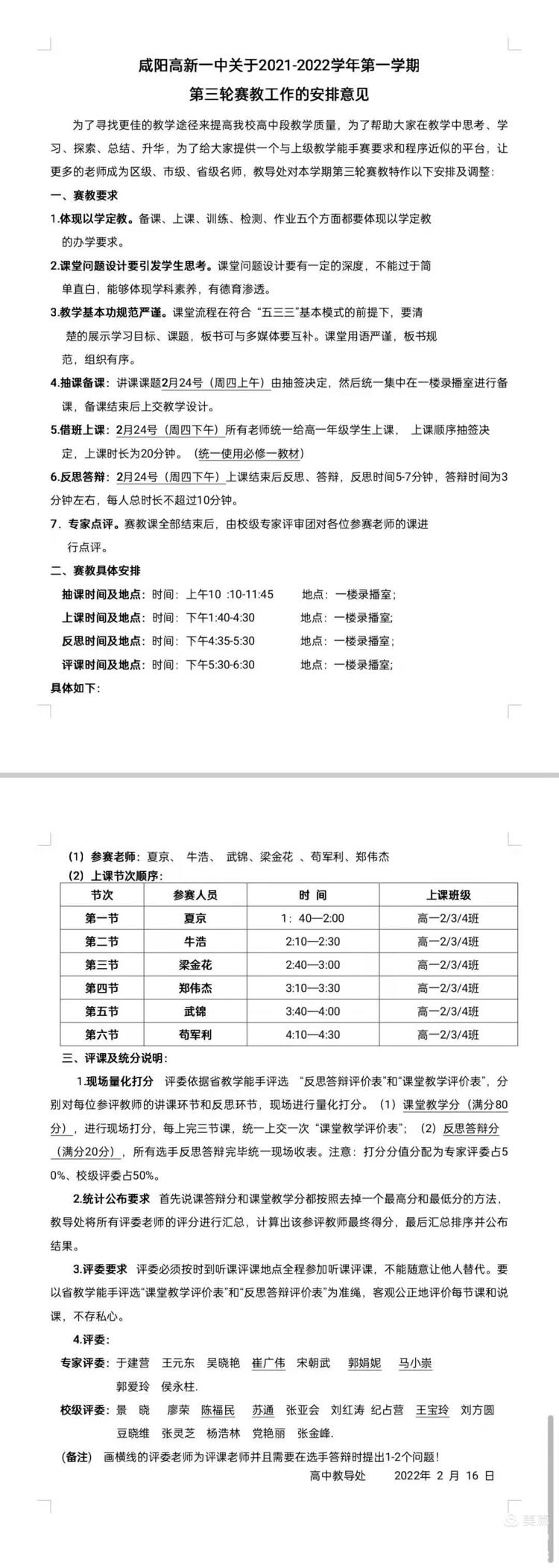为提高我校教师业务水平,督促各位教师在教学工作中勇于创新,勤于思考,习于探索,同时也为广大教师提供一个与上级教学能手赛教要求和程序近似的平台,让更多的老师成为区级、市级、省级名师,近日,咸阳市高新一中校高中部举行了2021-2022学年度第三轮赛教活动。