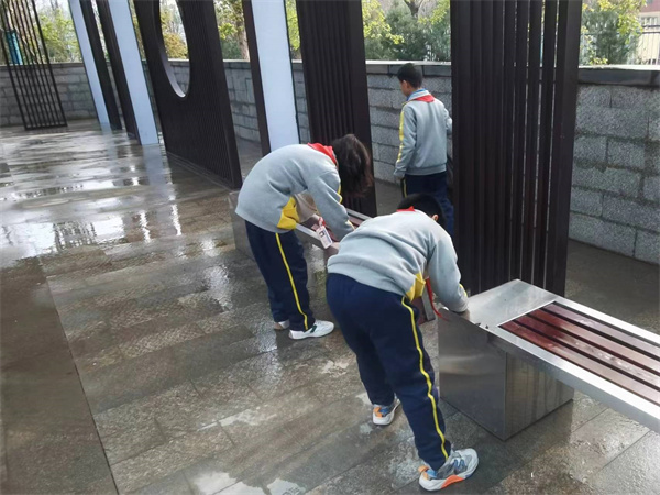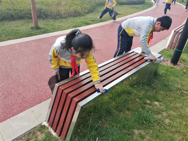 公园里老人在自娱自乐,孩童在欢快追逐。高新少年穿梭其中,他们或是捡拾草丛中的纸屑;或是擦洗休闲走廊里的桌凳,每一个角落都有他们小小的身影,用他们的双手维护着公园各类公共设施的卫生。