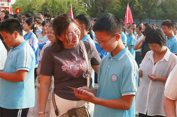 九年级二班赵誉莲家长也带来了深情的寄语。他表示感谢学校和老师们对孩子们的辛勤付出,同时也表达了对孩子们的殷切期望。他希望孩子们能够珍惜时间,努力学习,以优异的成绩回报老师和家长的关爱。最后,他也呼吁家长们全力支持孩子们的学习和生活,做孩子们坚强的后盾。