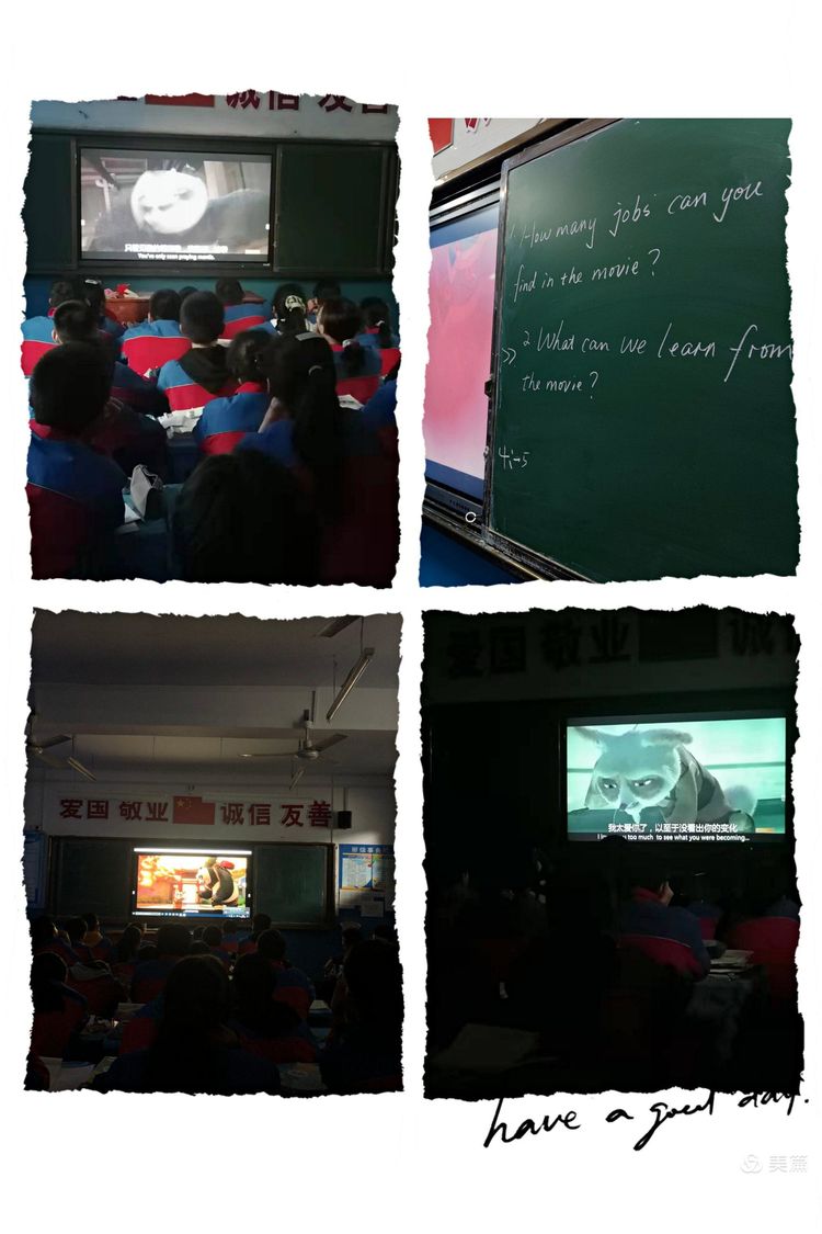 还记得那只胖胖的“阿宝”吗?《功夫熊猫》电影曾经风靡一时,可爱的“阿宝”形象被人们深深牢记。为了扩充词汇,练习听力,了解英语国家的文化,八年级英语组结合Unit 6有关职业的中心思想决定组织全年级学生观看Kung Fu Panda!