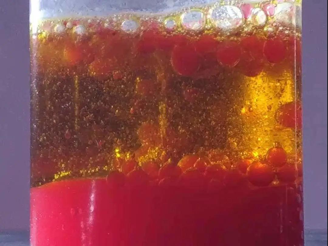 实验原理:本次实验的重点在于使用泡腾片,当泡腾片与水接触后会产生大量气泡(二氧化碳),气泡最终浮到油面以上,排放到空气中,这些气泡在上浮时会携带着许多小水滴一起上浮,当气泡排放到空气中时,没有了气泡的小水滴会降落到瓶子底部。