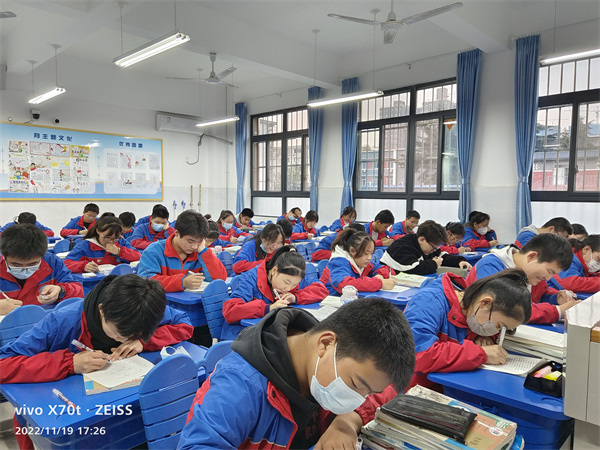大赛开始,同学们坐姿端正,认真作答。认真思考、规范书写,你追我赶,全力以赴,展现出了高新学子良好的精神风貌。