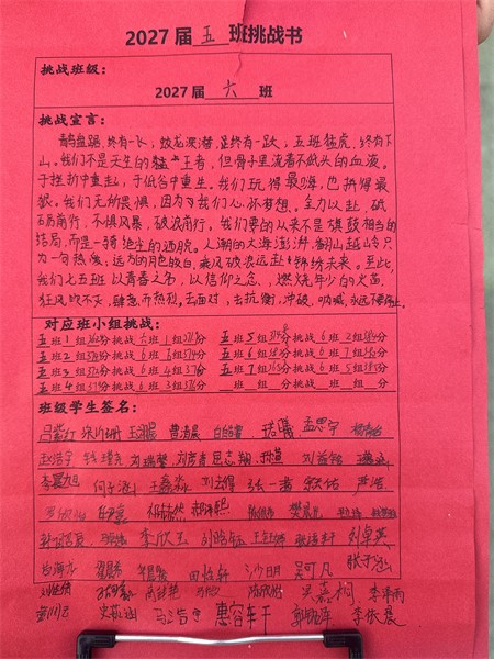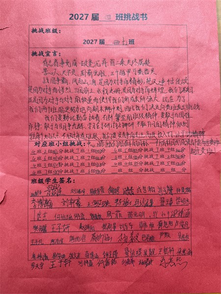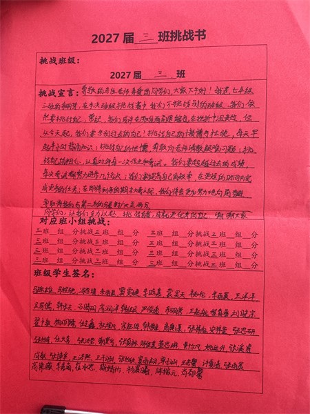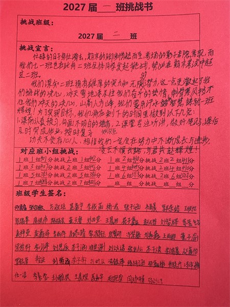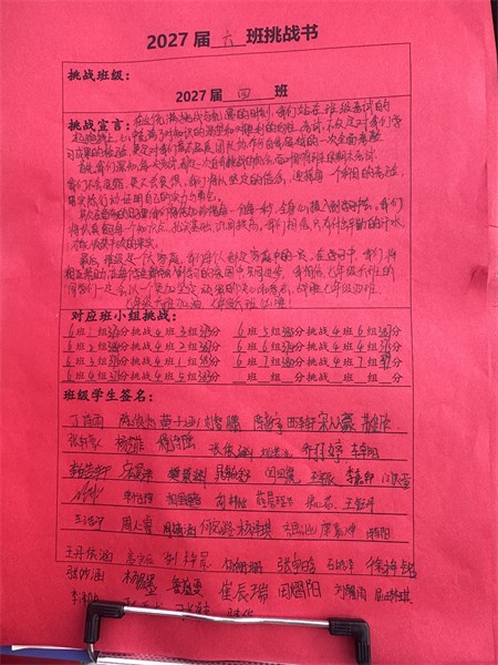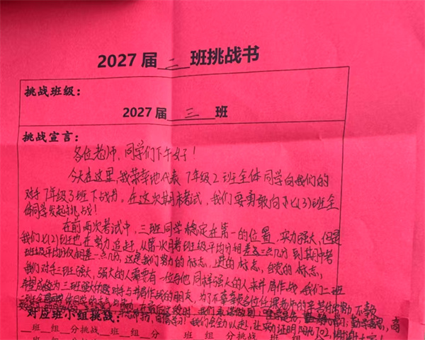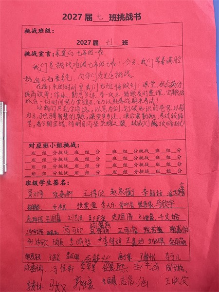 在班主任的悉心指导下,各个班级明确了各自的目标。学生们热情高涨,踊跃投身于挑战之中,他们齐心协力,共同为班级精神凝聚力量。每个班级的挑战口号或气势磅礴,或才情横溢,或坚定有力,无一不展现出七年级学生们的旺盛生命力和积极进取的青春风采。这极大地振奋了同学们的精神,激发了他们的学习热情。大家斗志昂扬,纷纷磨拳擦掌,满怀信心地准备全力以赴,勇敢面对挑战。
