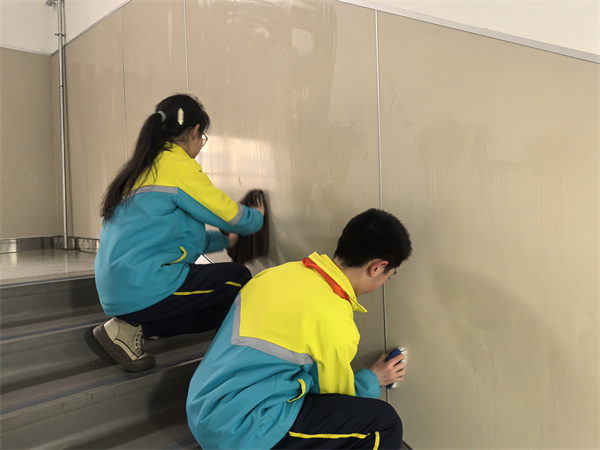 楼梯墙面焕彩志愿者们分组行动,携清洁工具穿梭于楼梯间。分工井然,或润湿墙面,或涂抹清洁剂,或以抹布精心拂拭。众人齐心,墙面重焕光彩,既净化了校园环境,也为学子通行添一份舒适。