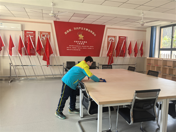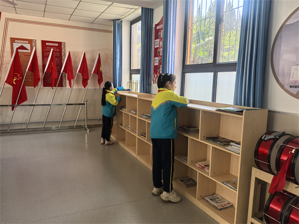 在图书室,书籍归位,书架井然,便捷阅读;在VR教室,设备擦亮,体验更佳;在少队部,室内焕然一新,为队员们营造更整洁的活动环境。