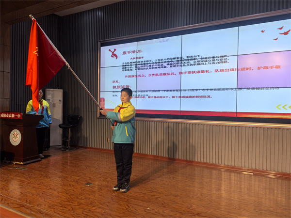 最后,大队部旗手现场示范,规范各中队大型活动执旗姿势。通过互动教学,详述动作要领,提升执旗水平,用手中的队旗彰显班级风貌。