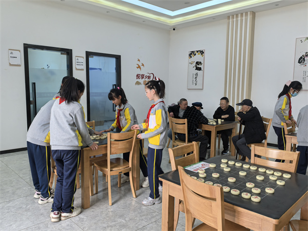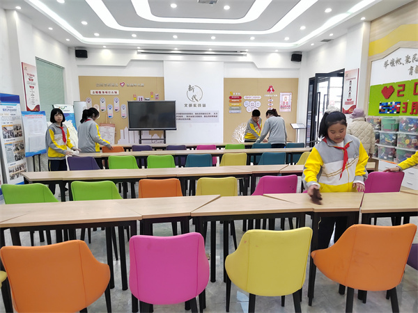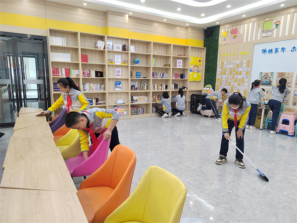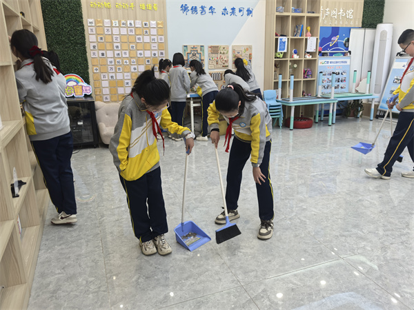 一部分师生来到社区的象棋室和图书室,他们拿起扫帚、抹布,细心清扫每一个角落,擦拭桌椅书架,整理书籍棋具。在他们的努力下,象棋室恢复了往日的宁静与整洁,图书室的书架也变得井然有序,为社区居民提供了更加舒适的学习环境。