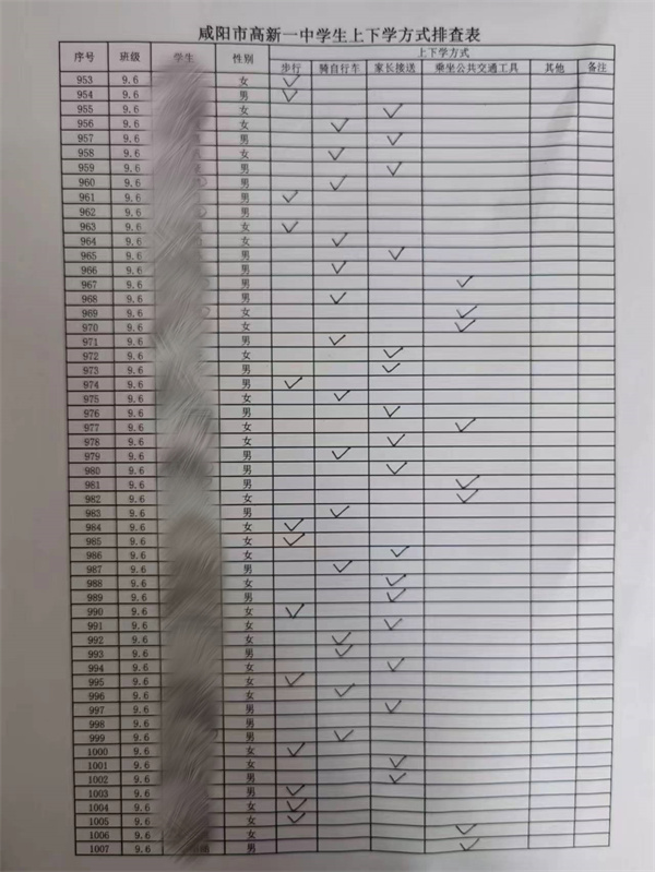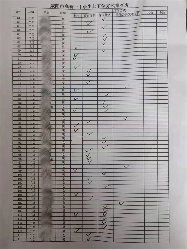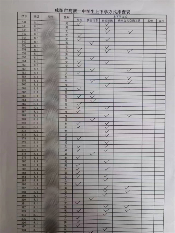 利用主题德育课时间,班主任对班级学生上下学的方式进行排查,以班级为单位归纳整理成安全台帐,一班一档,登记造册,一式两份,教导处和班主任各留存一份。