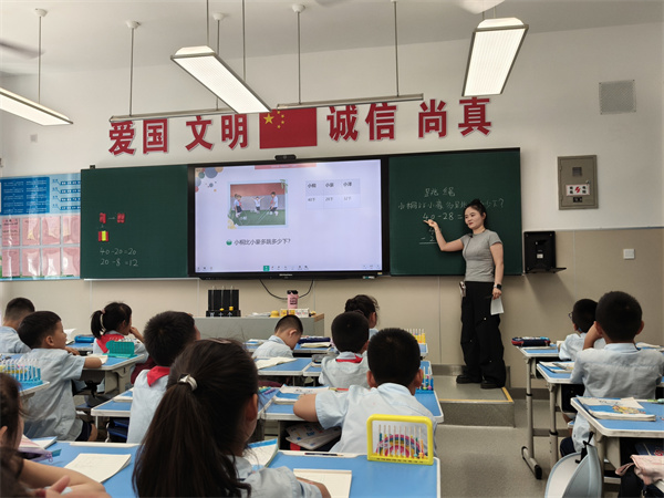 安苗苗老师执教《跳绳》一课,以本班学生跳绳的场景为话题导入学习,激发了学生的学习兴趣,吸引学生的注意力,引导学生利用了小棒和计数器动手操作并在组内交流,激发学生兴趣,培养学生的动手操作能力以及团队合作意识,促进学生自主探究退位减法的算理,引导学生自主列竖式,并在相互讨论和交流中掌握正确的计算方法。让学生在“玩”中相互探讨、相互启发、得出算理,掌握多种计算技巧。