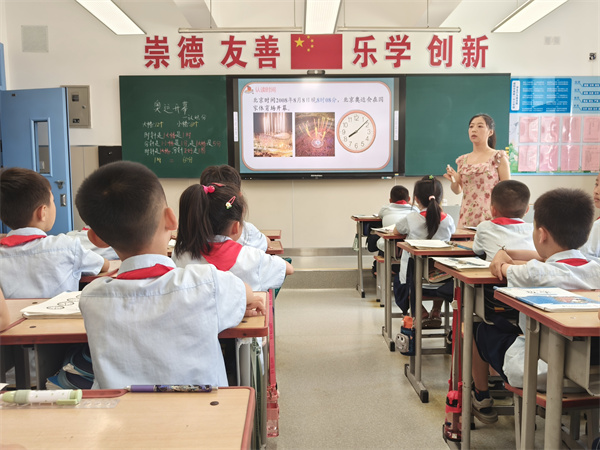 栗皓琛老师执教《奥运开幕》一课,从奥运开幕视频入手,让学生感受震撼的开幕仪式,做到了学科之间的融合,充分调动了学生的学习热情,将课堂点燃。在时针分针特点描述时,用儿童化的语言,让学生记住指针特征。整节课思路清晰,从认识钟面,时与分的关系再到认识时间,层层深入,循序渐进,课堂中师生合作,一问一答,引发思考,师生一起感受知识的形成过程。