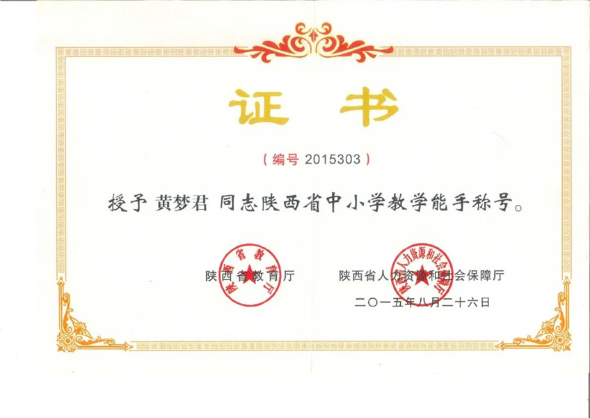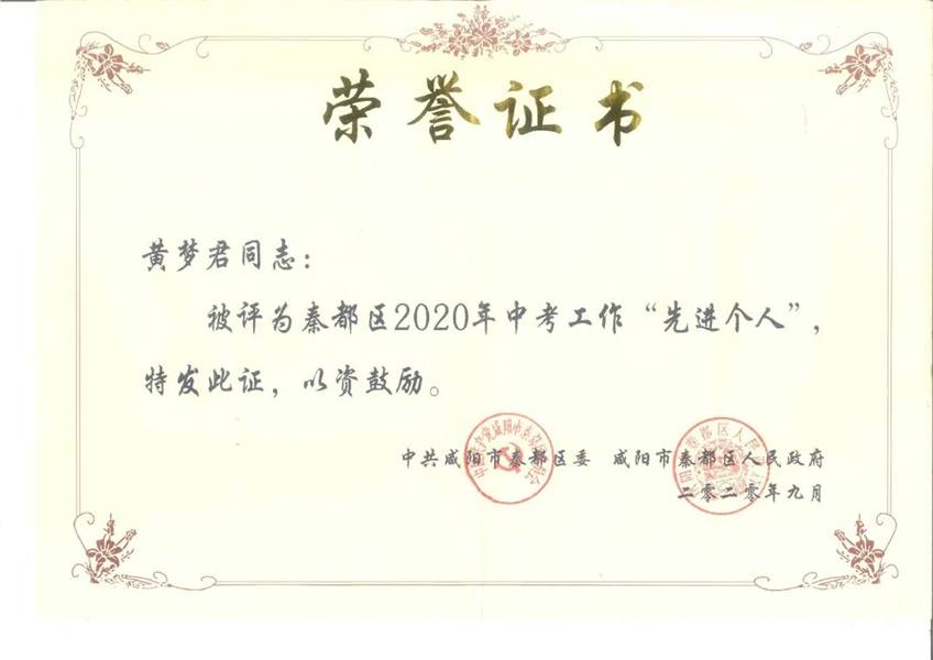 黄梦君,省级教学能手,毕业于咸阳师范学院英语系,中教高级。所带班级成绩名列前茅,多次获得校、区级市级荣誉。2012年获得区级“骨干教师”称号; 2014获得西北地区首届“中国好课堂”英语学科赛教“一等奖”;2015年获得“咸阳市教学能手”及“陕西省教学能手”称号;2016年获得秦都区“优秀园丁培养教师”称号;2020-2024年连续荣获秦都区中考“优秀班主任”、“优秀教师”、“中考先进个人”等称号。 2019-2021年多次被聘为:咸阳市教师资格证考试面试官。2024年荣获“秦都区第二届名班主任”称号。多篇论文荣获市、区级一、二等奖并在《咸阳教育》发表。多篇微课题荣获市、区级一、二等奖。