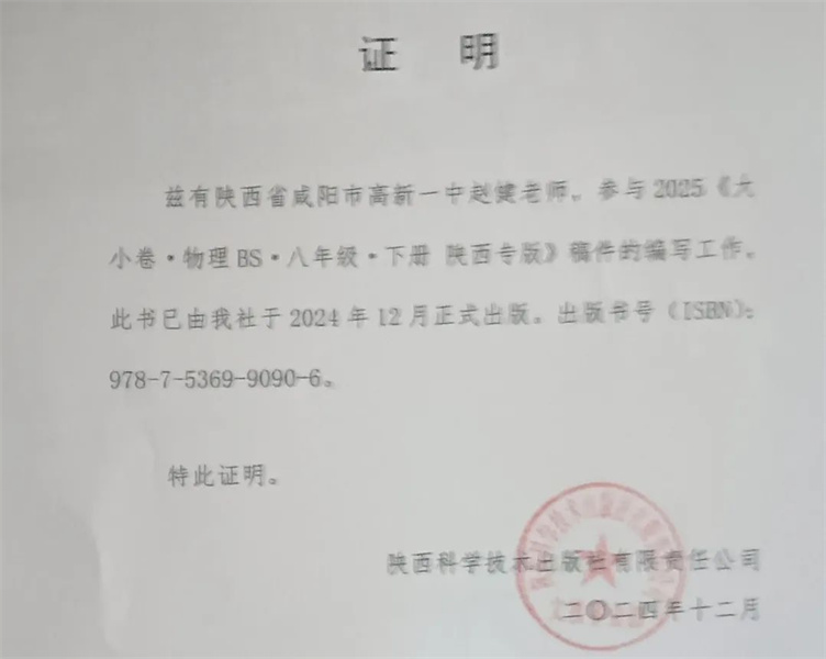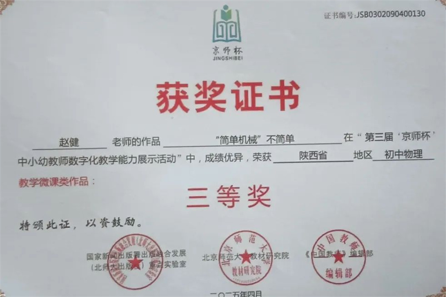 所带班级物理成绩2020年全区抽考成绩全区第一名;2025被陕西科学出版社邀请参与编辑《大小卷·物理BS八年级下册·陕西版》;2024年在陕西省教学评—致性中进行示范课;2024年随我校名师团参与对商南县湘河镇初级中学进行送教活动;2025年《简单机械不简单》微课在第三届“京师杯”中小学老师能力展示活动中,荣获陕西地区三等奖。