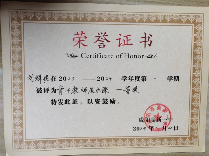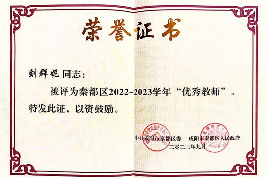 2017年获“秦都区教育教学工作先进个人”称号,2022年获“秦都区优秀班主任”称号,2023年获“秦都区优秀教师”称号。