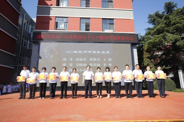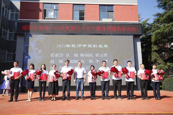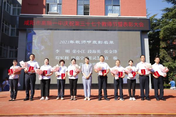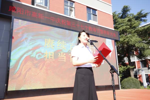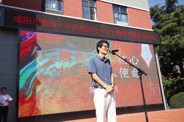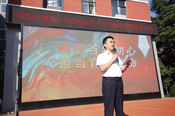 咸阳市高新一中副校长杨东宣读了教师节表彰先进集体及优秀个人的决定。一年来,在全校教职工的共同努力下,学校教育事业的快速健康发展,学校先后荣获了陕西省平安校园、“五育”作业展评优秀单位、秦都区德育工作先进单位、秦都区教育质量先进单位,渭滨办教学质量先进集体等荣誉,同时希望受表彰的教师们戒骄戒躁、再接再厉,号召全体教职工要以先进为榜样,扎实工作,奋发有为,为促进学校教育事业健康、协调、可持续发展做出新贡献。