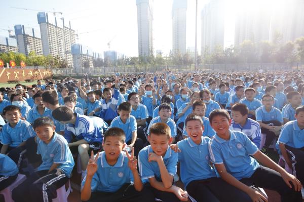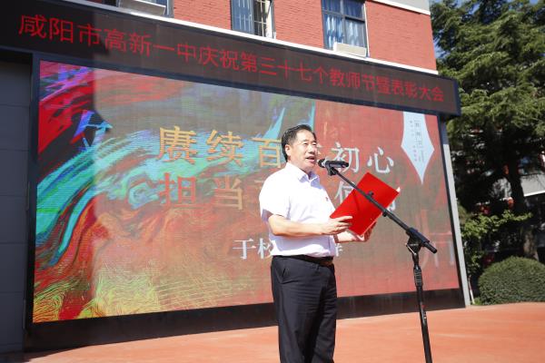 于建营校长在致辞中对秦都区委区政府、高新区管委会、各级领导、企业家和爱心人士大力支持表示了崇高的敬意和感谢。他讲到,近年来,学校发生了翻天覆地的变化,新的教学楼、综合实验大楼拔地而起,校园环境窗明几净,绿树成荫,钟灵毓秀,书香满园。在全校教师和学生的坚守奋斗和刻苦努力下,学校朝气蓬勃、守正创新、特色鲜明,在德育教育、教学质量、教学科研、学生政治思想教育,学生自主管理、家校合作等各方面都有跨越式发展,教育教学质量稳居咸阳名校行列。他号召全校教师在新时代背景下,不忘教育初心,继续坚守高尚的教育理想,时时仰望教育的星空,用大爱和责任实现教育初心,坚守教育本真,回归教育本位、追寻本质规律、形成教学主张,努力把学生培养成适应民族复兴、大国崛起的一代新人。
