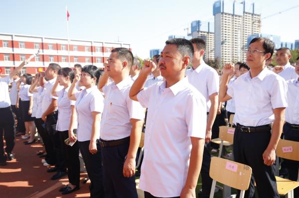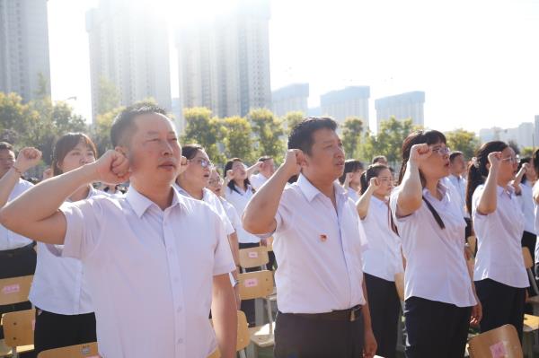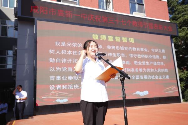“我是光荣的人民教师,我将忠诚党的教育事业……”在教师代表李秀的带领下,咸阳市高新一中的全体教师们高举右拳,庄严的宣誓。响亮的誓言,响彻天空,掷地有声,表达着教师们对教育事业的无限热爱和执着追求。