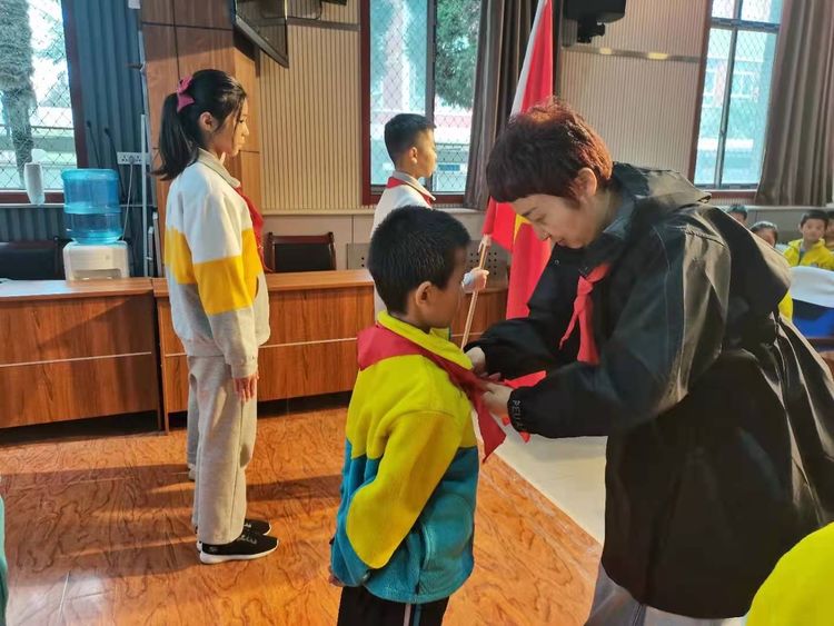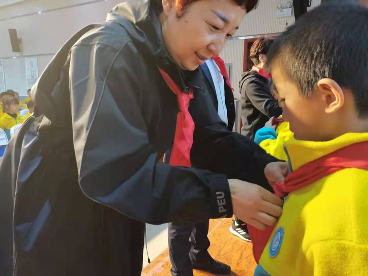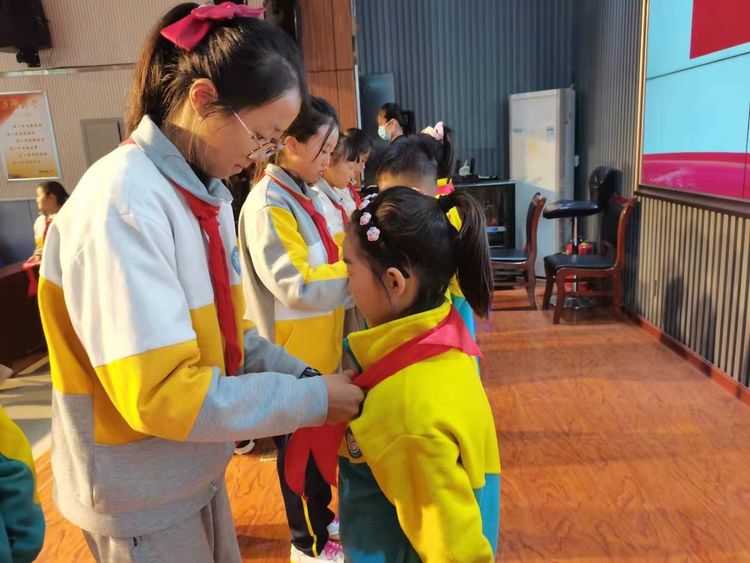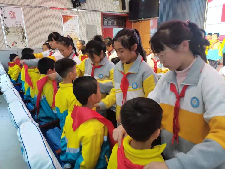 六年级的哥哥姐姐们为新队员们系上鲜艳的红领巾,今天,他们成为了一名光荣的少先队员!