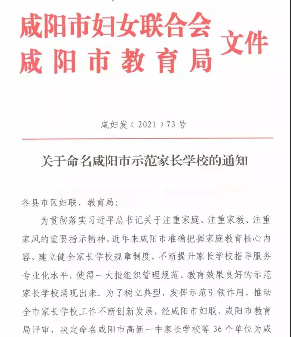 近日,咸阳市高新一中被陕西省教育厅授予陕西省教育厅中小学精品课项目学校;被咸阳市妇女联合会、咸阳市教育局命名为咸阳市示范家长学校。