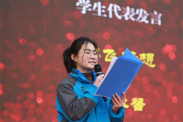 来自高二(二)班学生代表刘睿馨作了表态发言。一日之计在于晨,一年之计在于春。春天是美好的开始,新学期里,她将和大家一起,带上毅力、坚持和拼搏,背负老师的嘱托、父母的期望,奋力穿透重重阻碍,共同实现永不坠落的梦想。