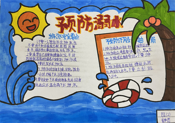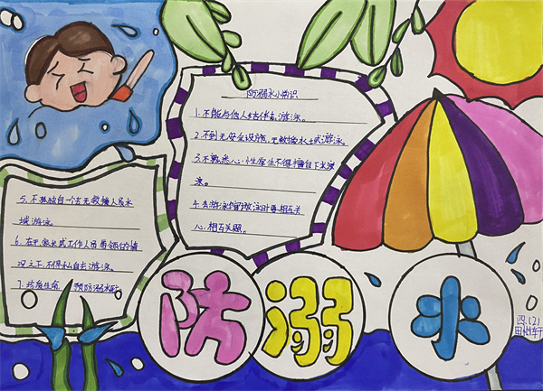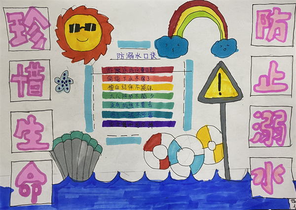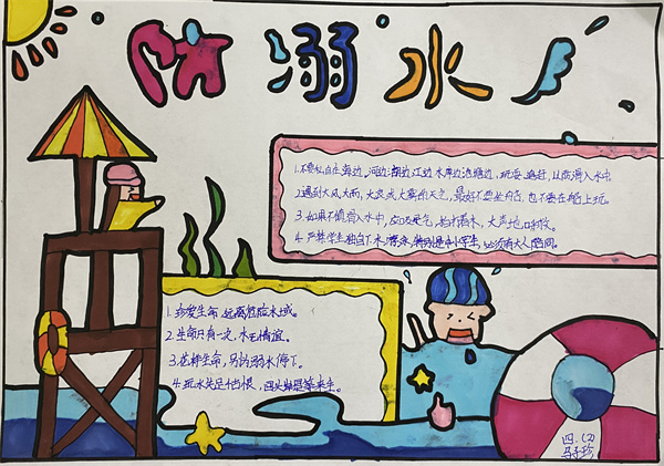 溺水是造成青少年儿童意外死亡的第一杀手。汛期、暑期即将来临,溺水事件进入易发高发期。近期,省内外发生多起学生溺亡事件,令人痛心,教训深刻!为此,学校十分重视学生的防溺水教育工作,通过广播站宣讲、召开主题班会等形式,教育孩子了解并熟知防溺水、防中暑、防火、防电等安全知识,并安排学生绘制手抄报,进一步增强安全意识。