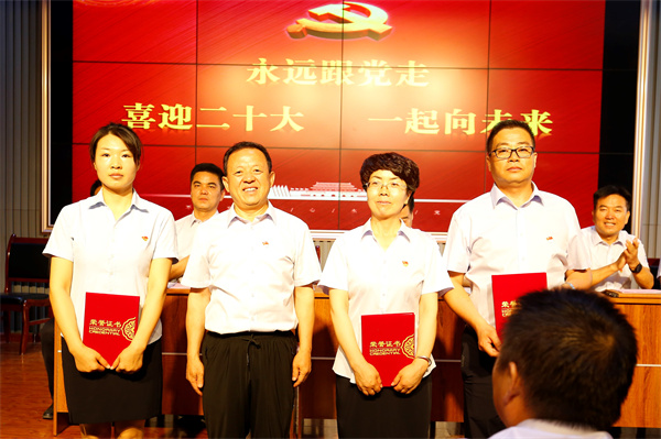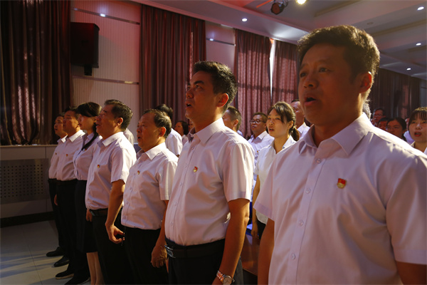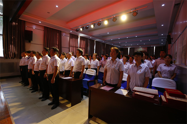 在党总支书记、校长于建营的带领下,全体党员高举右拳,郑重宣誓, “我志愿加入中国共产党,拥护党的纲领,遵守党的章程,……”。铮铮誓言,掷地有声,响彻整个礼堂,表达着对党的庄严承诺和随时准备为党牺牲的决心。