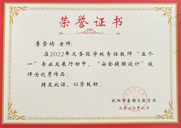 李雪婧老师在2022年义务段学校专任教师“五个一”专业发展行动中“安全提醒设计”被评为优秀作品;