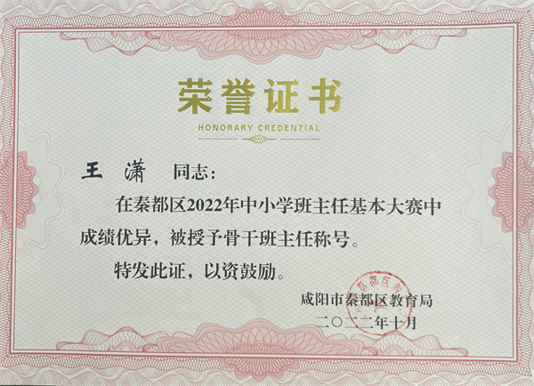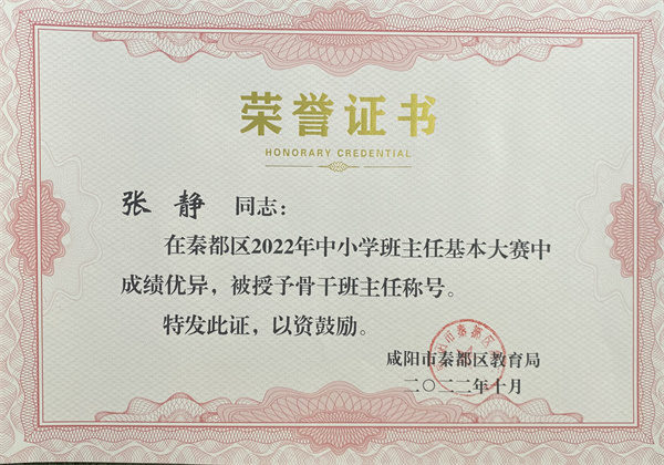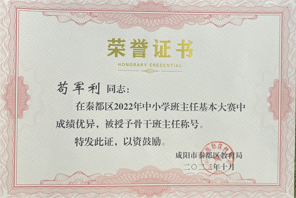 王潇、张静、苟军利三名教师在秦都区2022年中小学班主任基本大赛中被授予骨干班主任称号。