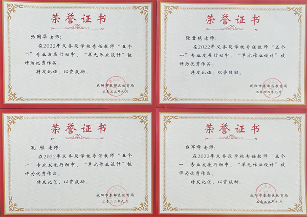 张君艳、张国华、白军峰、孔胜四名教师在2022年义务段学校专任教师“五个一”专业发展行动中“单元作业设计”被评为优秀作品;