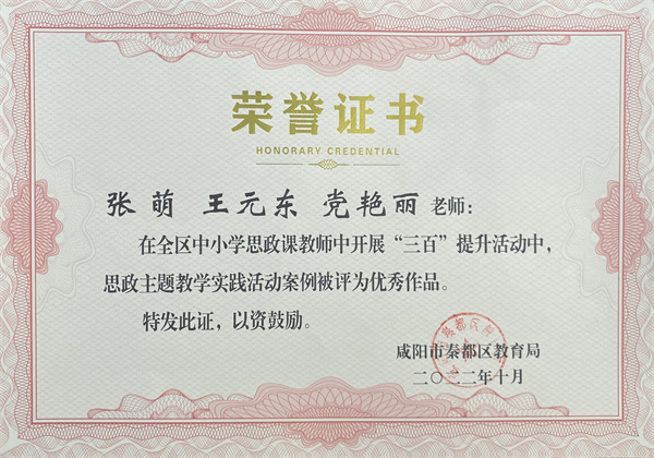 张萌、王元东、党艳丽三名教师在全区中小学思政课教师开展“三百”提升活动中,思政主题教学实践活动案例被评为优秀作品。