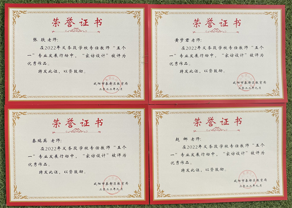 张轶、秦瑞英、赵娜、黄梦君四名教师在2022年义务段学校专任教师“五个一”专业发展行动中“家访设计”被评为优秀作品;