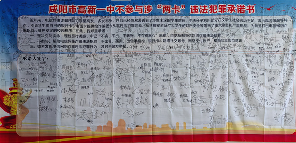 活动结束后,同学们纷纷在“不参与涉两卡违法犯罪承诺书”上签名,承诺一定要自觉遵守法律和学校的各项规章制度,努力规范自己的行为,争做学法、知法、守法,共筑安全网的好学生。