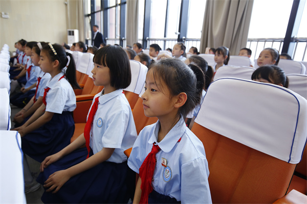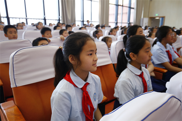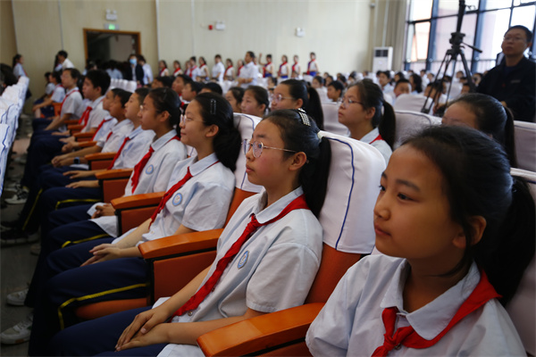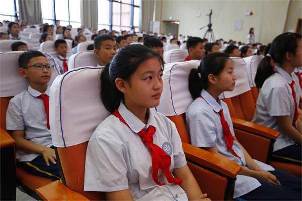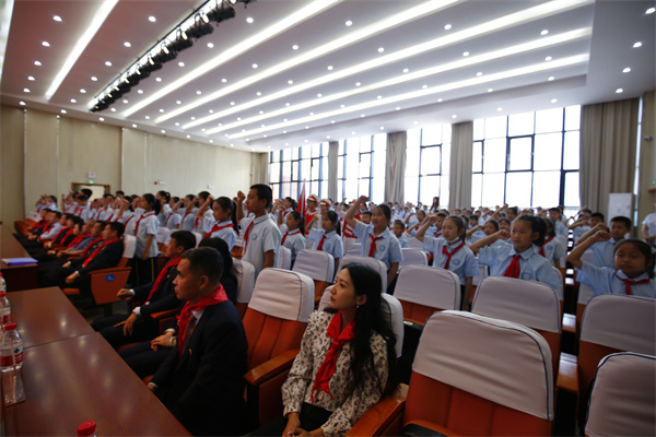 红领巾是红旗的一角,是用革命鲜血染红的,那鲜艳明亮的红色将引领队员们向真向善向美,做新时代的好少年!面对鲜红的队旗,新队员们庄严宣誓,铮铮誓言响彻整个礼堂。
