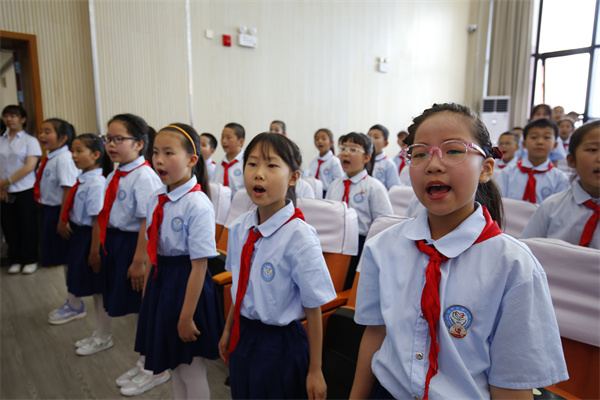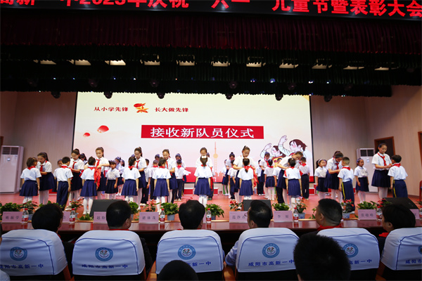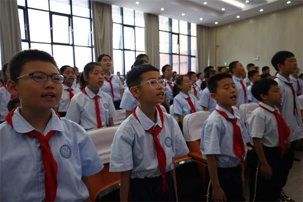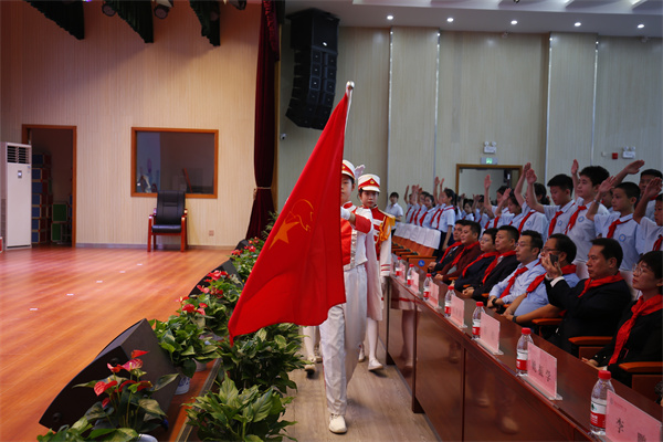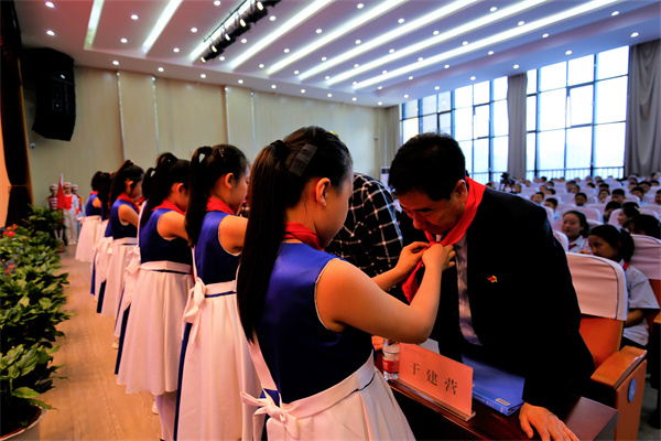 伴随着嘹亮的出旗曲,旗手们迈着矫健的步伐,精神抖擞地高举队旗出场,队员们满怀激情唱队歌,接受新队员入队,并为新队员佩戴红领巾。