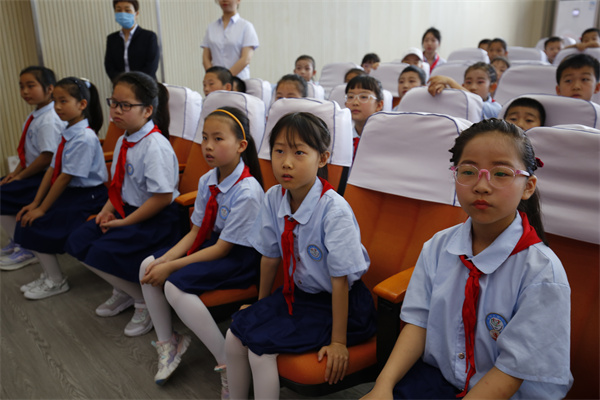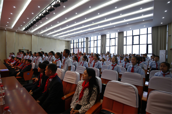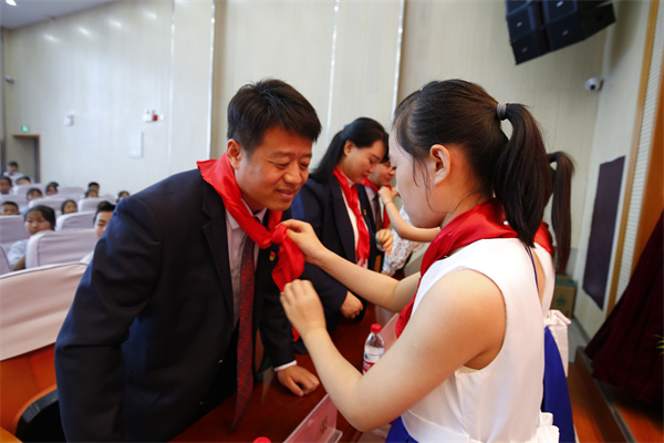 少先队员为出席大会的领导和来宾佩戴红领巾。