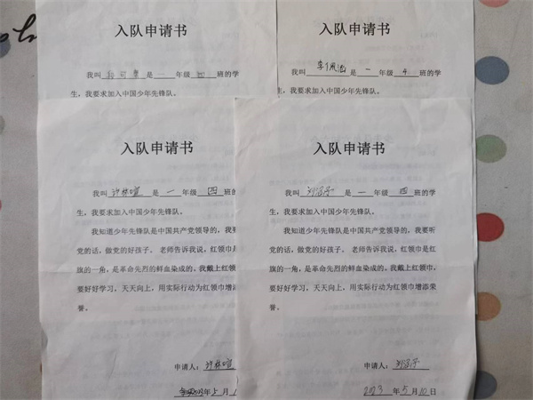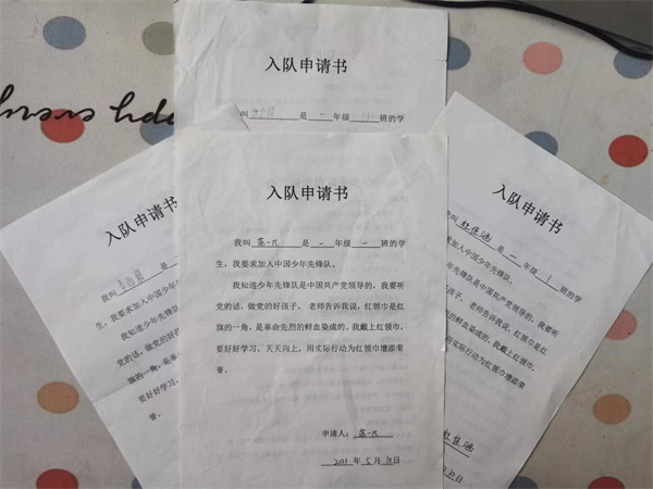 新队员们怀着激动的心情,认真填写入队申请书,牢记入队知识,严格要求自己,争取早日戴上红领巾。