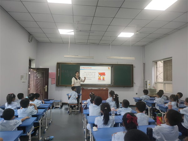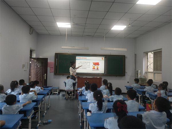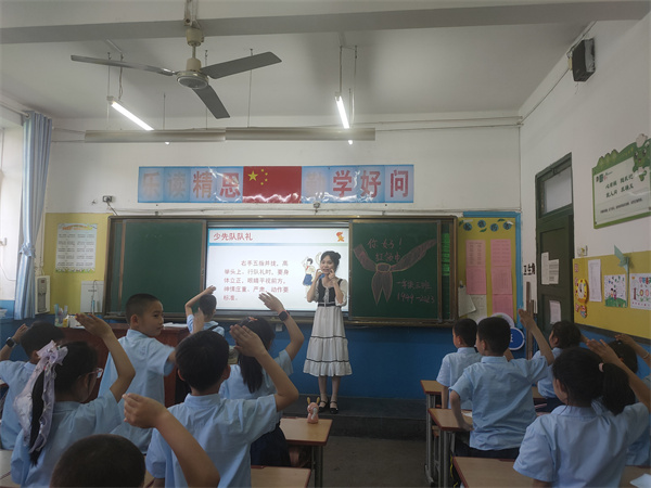 班会上中队辅导员们认真的给新队员们讲解少先队知识,并对红领巾的含义、佩戴和使用、队徽队旗的含义、少先队礼仪、如何正确呼号等少先队知识进行了详细的讲解和示范。