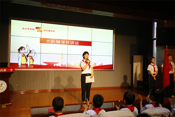 大队辅导员冯娟老师代表所有的辅导员老师和老队员为新队员们送上真挚的祝贺,并鼓励新队员们不断进取,争先锋,树榜样,努力成为有理想、有道德、有文化、有纪律的社会主义事业接班人。