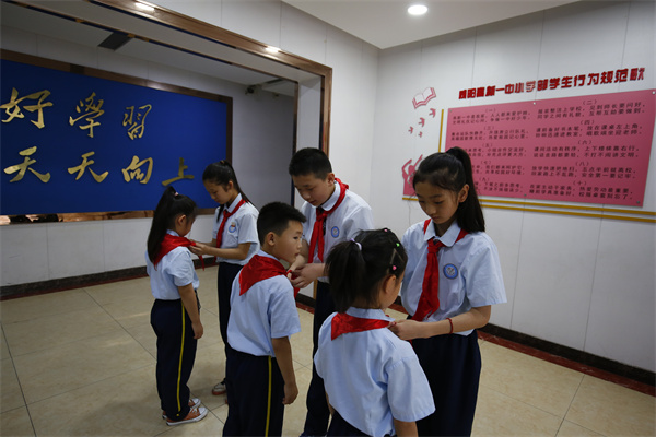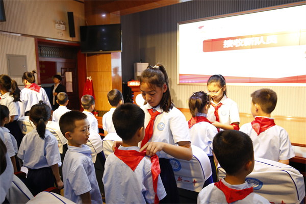 大队干部们认真的教新队员们戴红领巾,队员们脸上洋溢着自豪的笑容。