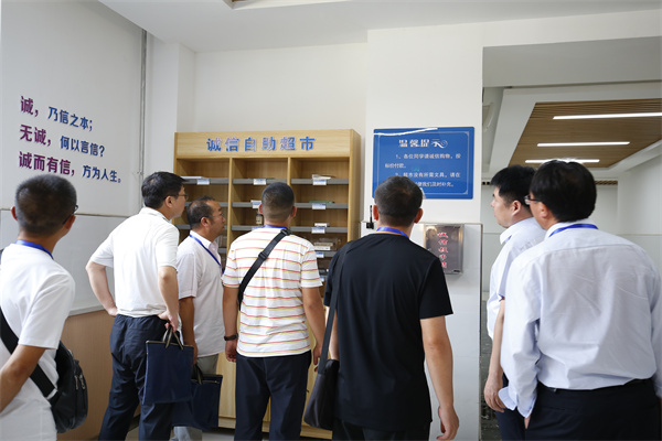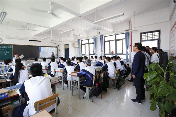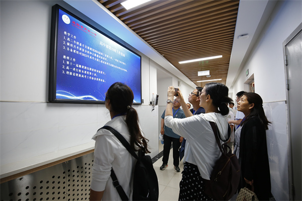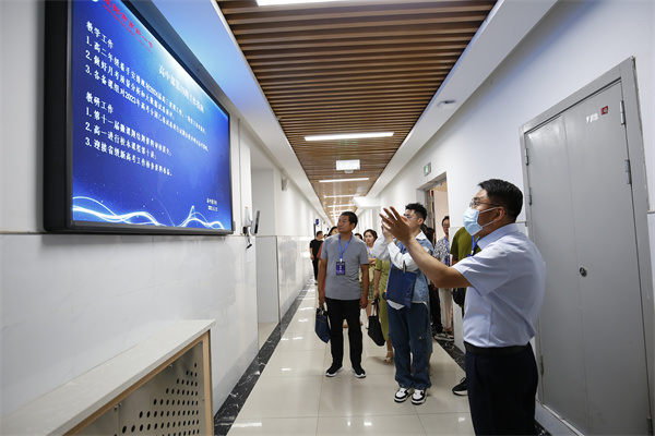 在高中部教导主任陈福民、高中部德育主任崔广伟的带领下,研修班一行分别参观了我校大数据中心、多功能会议室、双师班、电子班牌、诚信超市、读书吧、学科实验室等,先进的基础设施建设、信息化的教学设备、师生向上的精神风貌、优美的育人环境得到了参观人员的一致好评。