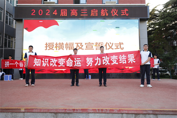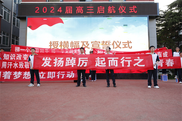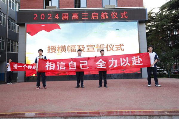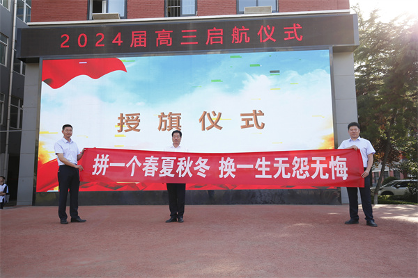 于校长为2024届新高三年级授年级组启航旗帜,廖校长为各班授高三启航横幅。鲜红的横幅和响亮的口号展示了各班奋战高三的决心,展现了奋发向上、勇挑重担的良好精神风貌。新的征程,新的跨越,我们要用新的奋斗去摘取新的硕果。