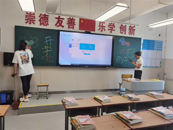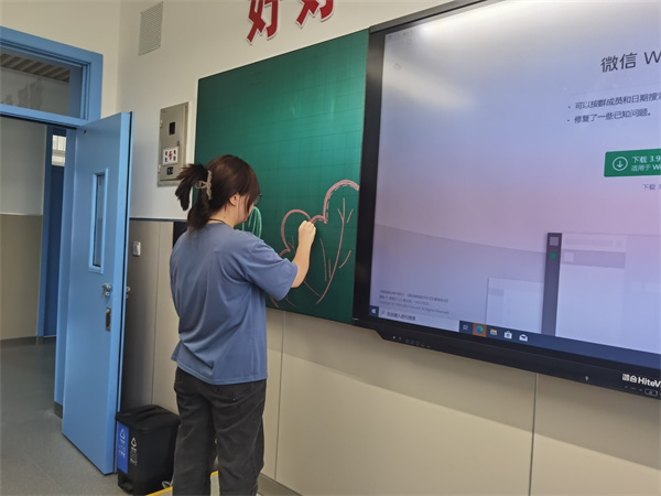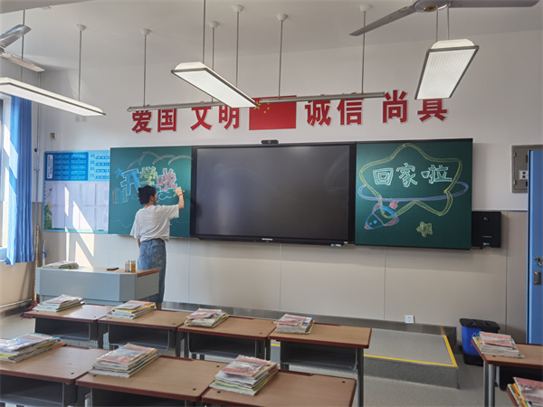 焕然一新的小学部教学楼里,老师们早早的来到班级里,她们用灵巧的双手绘制着童真的欢迎语,使教室看起来格外的温馨和舒适。