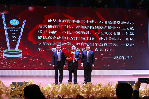 温馨的音乐轻轻响起,每一位老教师走上舞台时,台下掌声如潮。这些耕耘了三十载的教育工作者,他们的脸上写满了岁月的沧桑,而眼中却依然闪烁着对教育事业的执着与热爱。校长于建营、副校长程颖斌、杨东、李江河、廖荣为每位老教师递上象征着荣誉与感激的荣誉证书和奖杯。
